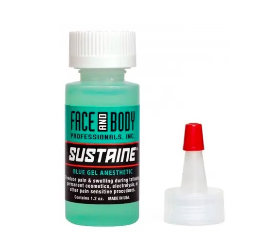 Sustaine Blue Gel — ефективна альтернатива для вторинної анестезії під час татуажу та мікроблейдингу. Він надійно підсилює й продовжує дію первинної анестезії. Переваги Сустаїн гелю містять не тільки знеболювальний ефект, але й кровоспинні та протинабрякові властивості. Крім того, він запобігає появі гематом навіть на найчутливіших ділянках. Сустаїн гель був спеціально розроблений для знеболення косметологічних процедур у сфері обличчя, тому він підходить для всіх типів шкіри та гарантує безпеку застосування. Не викликає печіння або почервоніння шкіри та не має різкого запаху. Його склад містить адреналін, тетракаїн і лідокаїн. Тривалість знеболювального ефекту становить до двох годин. Важливо пам'ятати, що надмірне використання Сустаїн гелю може негативно вплинути на всмоктування пігменту, тому повторне нанесення не рекомендується.